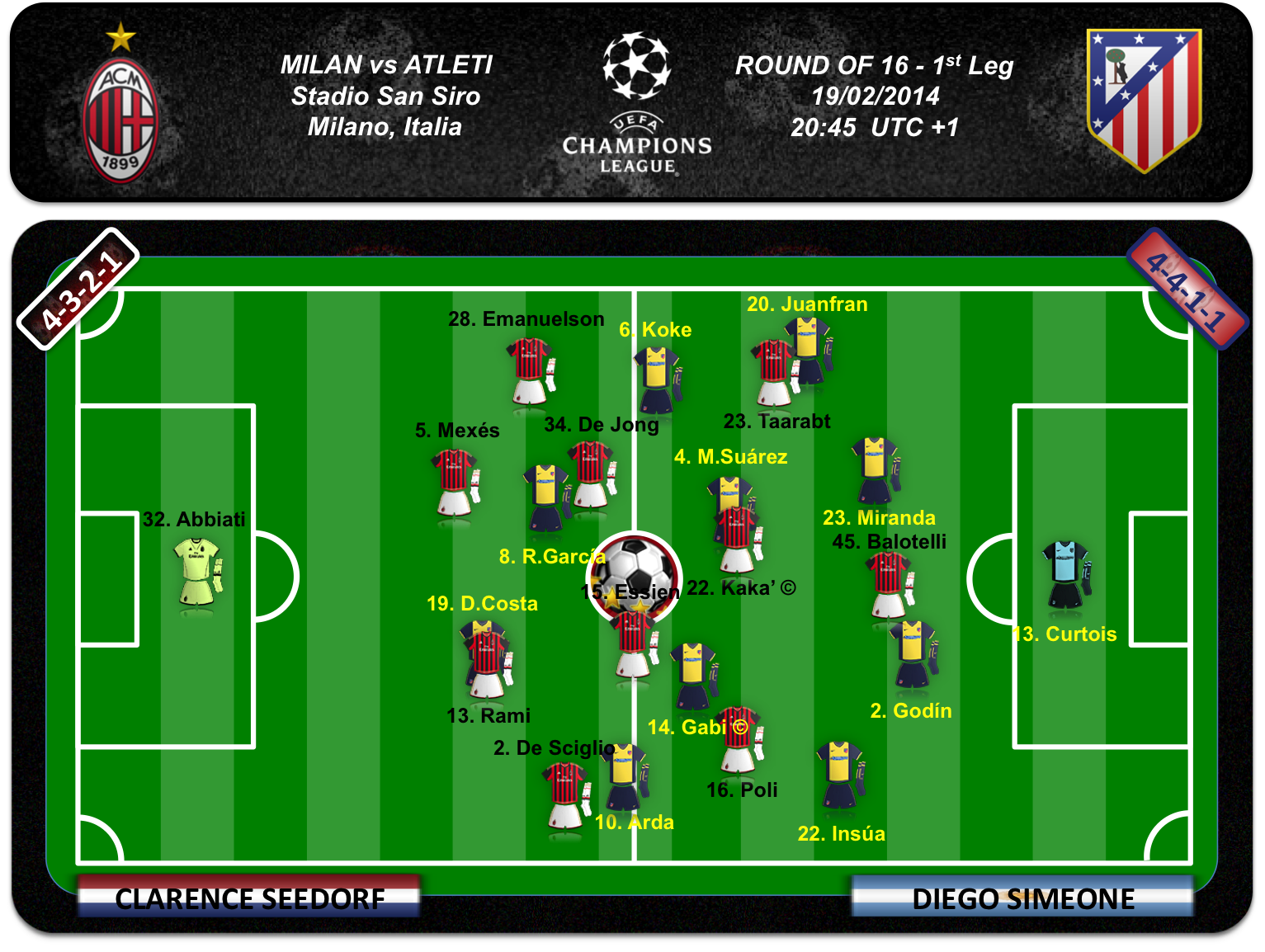 Mientras tanto, Clarence debe improvisar como pueda un once titular que logre crear problemas al Atleti en Champions. Según sus propias declaraciones, De Sciglio se exprime mejor que nadie en el lateral derecho, dejando a Emanuelson como lateral por izquierda. En el centro de la defensa, Rami ha demostrado poseer buenas capacidades técnicas y sabe utilizar su portentoso físico para desplazar a los delanteros en el área, algo muy útil frente a Diego Costa, por ejemplo. Su pareja será el eslabón débil, pues ni Mexès ni Bonera dan la talla. Debido a acumulación de tarjetas, ni Montolivo ni Muntari podrán jugar esta noche, así que Essien y De Jong formarán probablemente la pareja del medio. Sin embargo, en vista de las ausencias de Robinho (lesión) y Honda (no elegible por haber jugado con CSKA en Champions) existe la posibilidad de que Clarence modifique hoy su 4-2-3-1 a favor de un 4-3-2-1, al más puro estilo Ancelotti.
