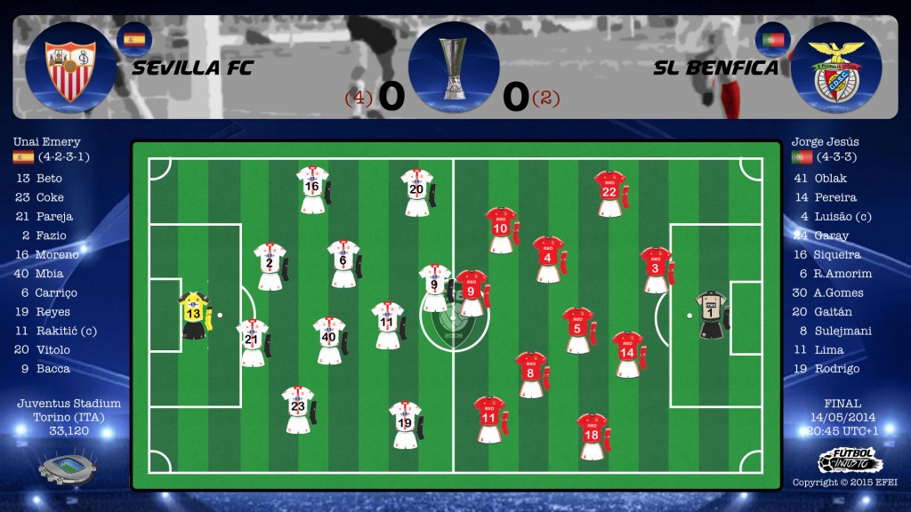 En Turín, el Benfica iba a ser el rival en una final que también se iba a resolver de una forma tremendamente emocionante. Resultó absolutamente increíble que el marcador permaneciese inmóvil durante los 120 minutos de juego que se disputaron, ya que ambos conjuntos gozaron de una gran cantidad de ocasiones, pero la mala puntería de los atacantes y algunas intervenciones inverosímiles de Beto y Oblak hicieron que el título se tuviera que decidir desde los 12 pasos.